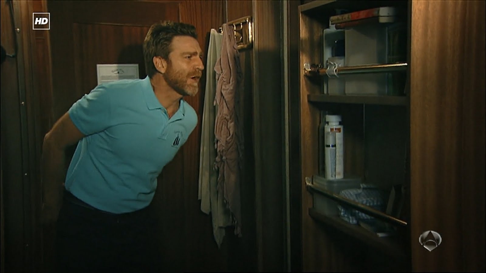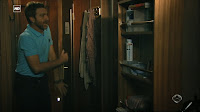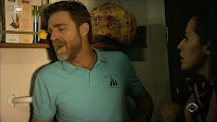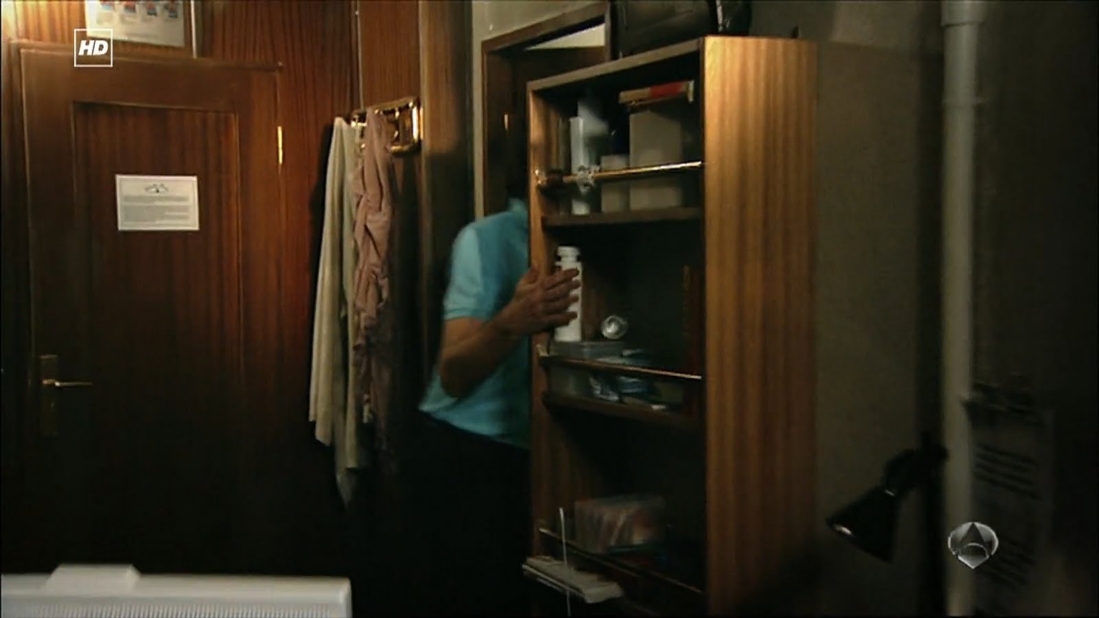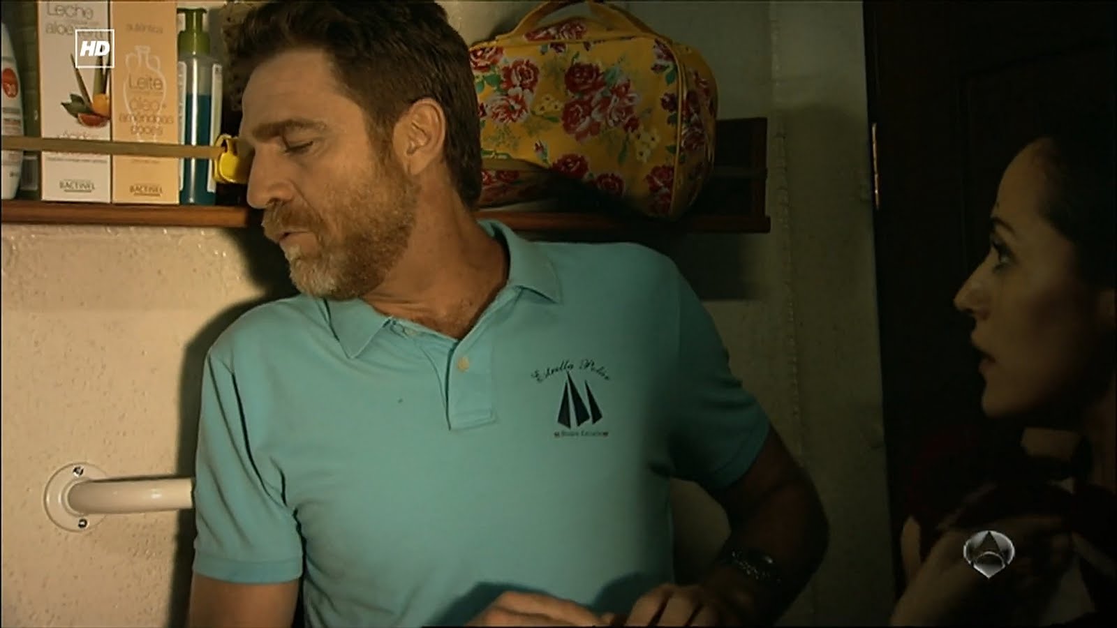 Capturas de la divertida escena del Capítulo 1x06 titulado Elecciones en la que Julia está terminando de ducharse en su camarote cuando Ricardo va a hablar con ella para preguntarle qué está pasando y tras un movimiento brusco por el encallamiento del Barco termina encima suyo.